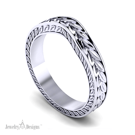 It’s in the details! Crafted from white gold this elegant floral vine band displays a continuous wandering vine with intermittent diamonds that encircle the finger. The outer edge of this ornate ring is meticulously detailed with a delicate leaf pattern to contrast and frame the floral theme. Our jewelry designers created this floral band with […]