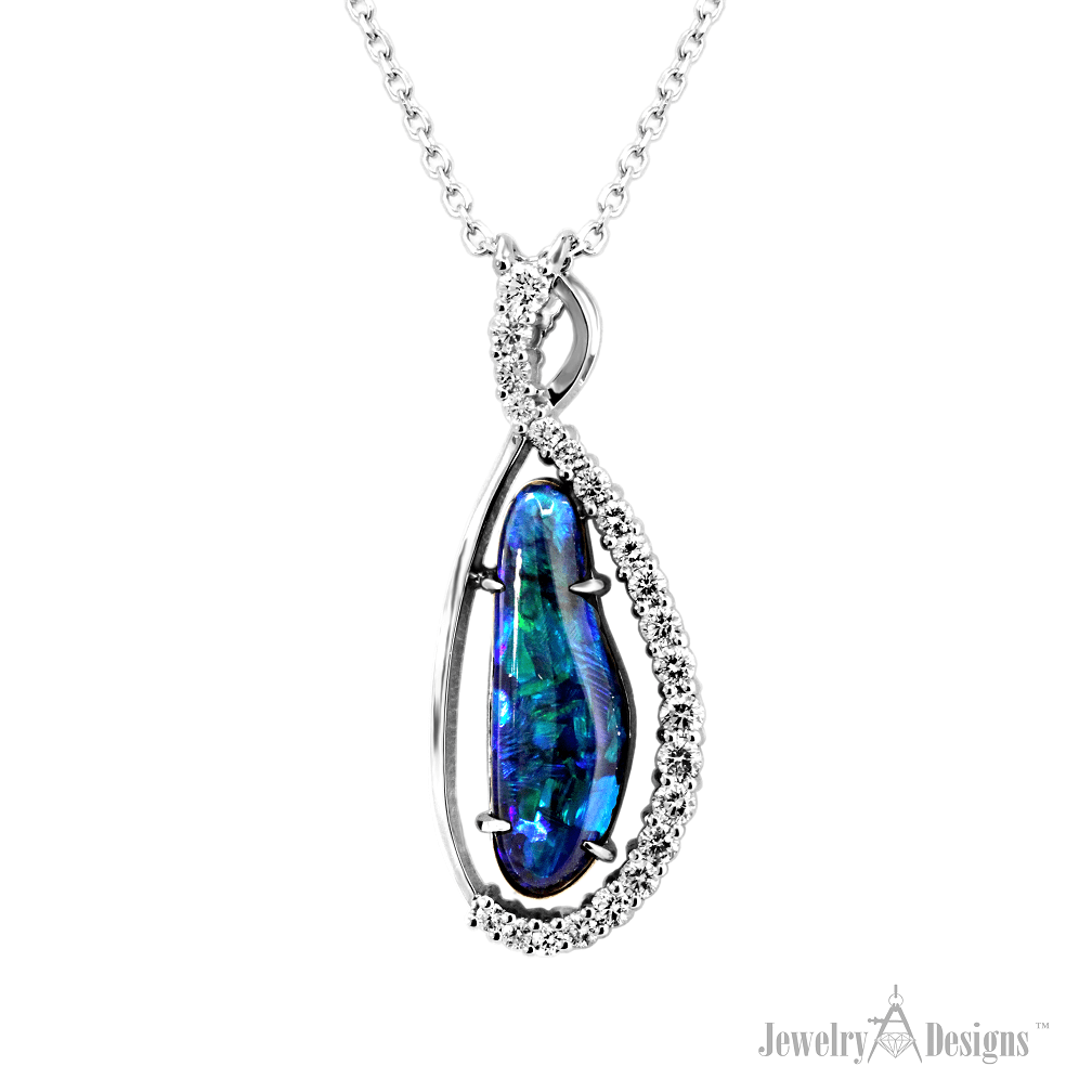 Free Floating Black Opal Perhaps no stone is more enchanting than the one in this Designer Black Opal Necklace, and our artisans certainly captured the beauty of this in a free floating design. This magnificent 4.75 ct free form Australian black opal is laced with a stream of white gem grade diamonds totaling .85 ct. […]