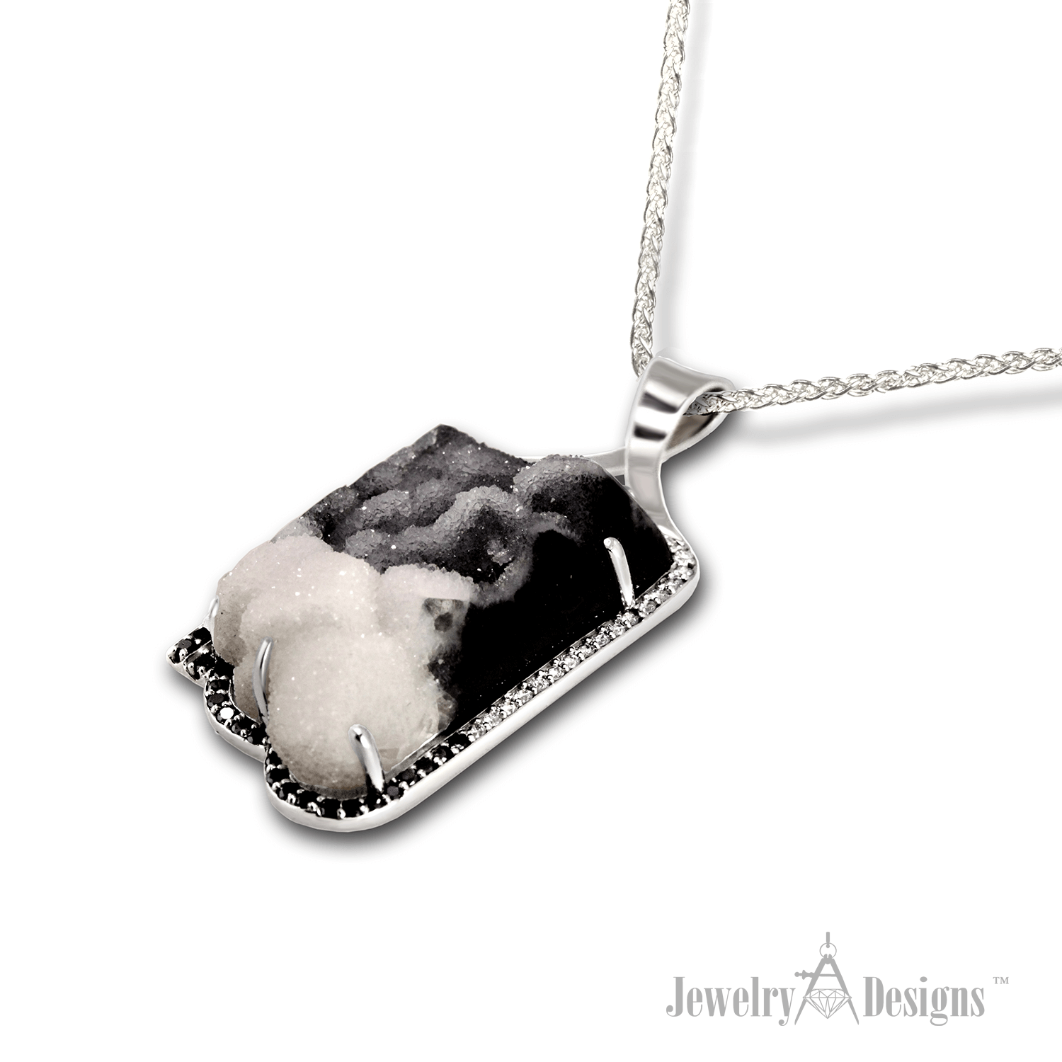 Free Form Drusy Cloud Our Black White Drusy Necklace is surrounded by black and white diamonds in a handmade white gold setting. The glistening terminated crystals in our Drusy quartz are offset by contrasting black and white diamonds set in a wrap with hand cut raised beads. The reverse side of our nontraditional necklace is […]