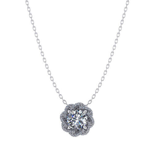 Transform your style with our Diamond Twist Necklace, a masterpiece of light and elegance designed to capture the essence of sophistication. This diamond halo pendant’s twisting center surrounds a stunning 1.2 carat stone, customizable to include the diamond that perfectly mirrors your preferences. Encircling this focal point are accent diamonds totaling .184 carats, each meticulously set to enhance the central gem’s radiance. Offered in 14K white, yellow, and rose gold, as well as 18K gold or platinum upon request, this halo diamond necklace allows for the addition of alternate diamond sizes or vibrant gemstones to match your unique taste. Discover the allure of this magnificent piece, crafted to bring a touch of sparkle to every occasion.
